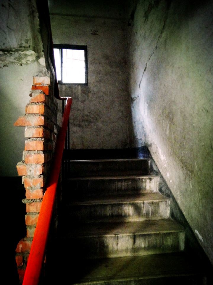 塑膠紅色樓提扶手,晦暗且看不出顏色的樓梯